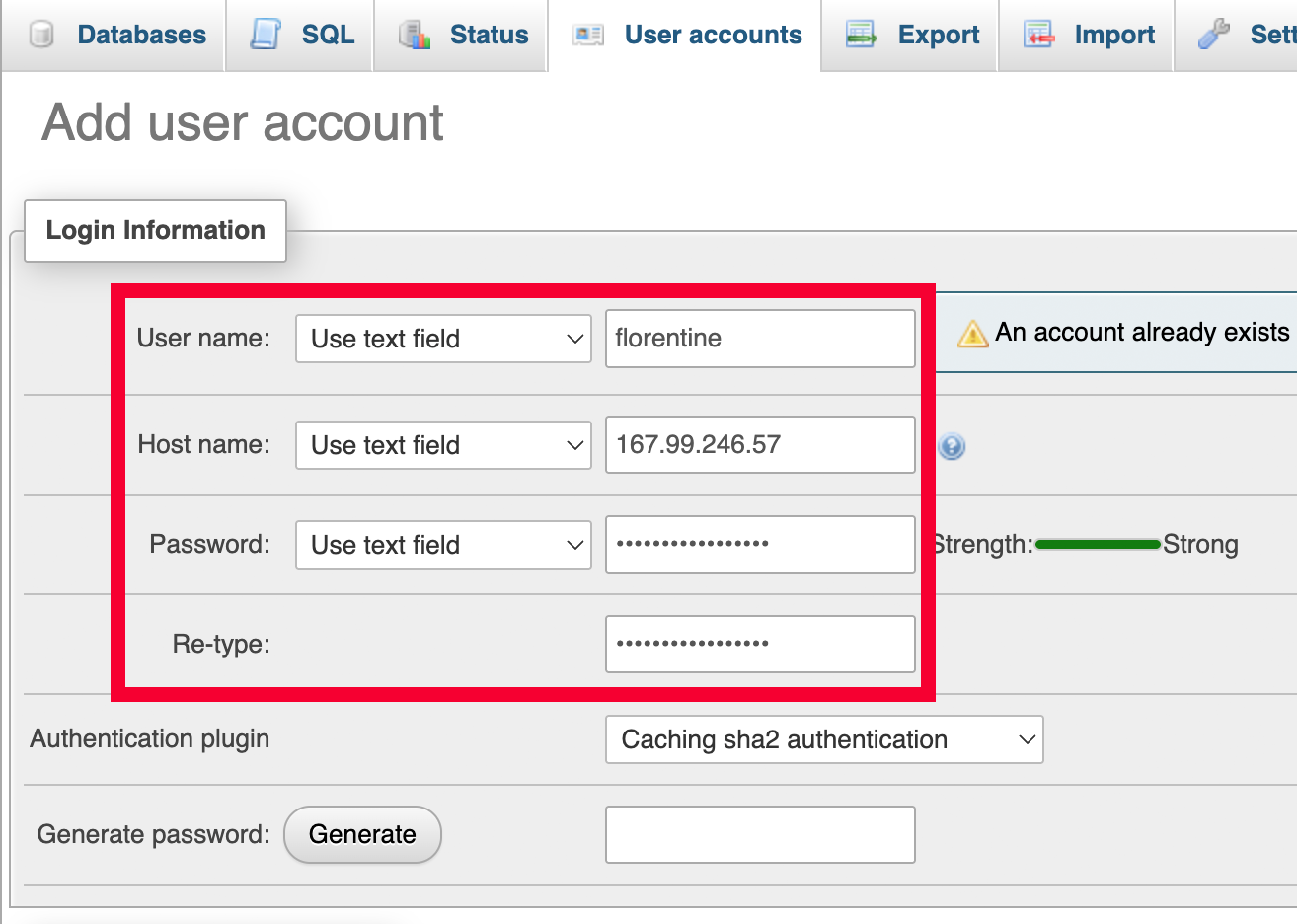 phpMyAdmin only creates the database user. You might also need to configure your server firewall to allow the Florentine.ai IPs.