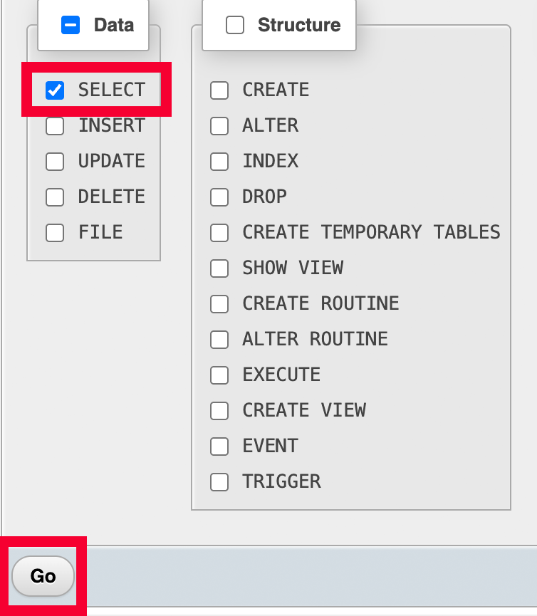 Scroll down to the Data section inside the Global privileges section, check SELECT and click on Go: