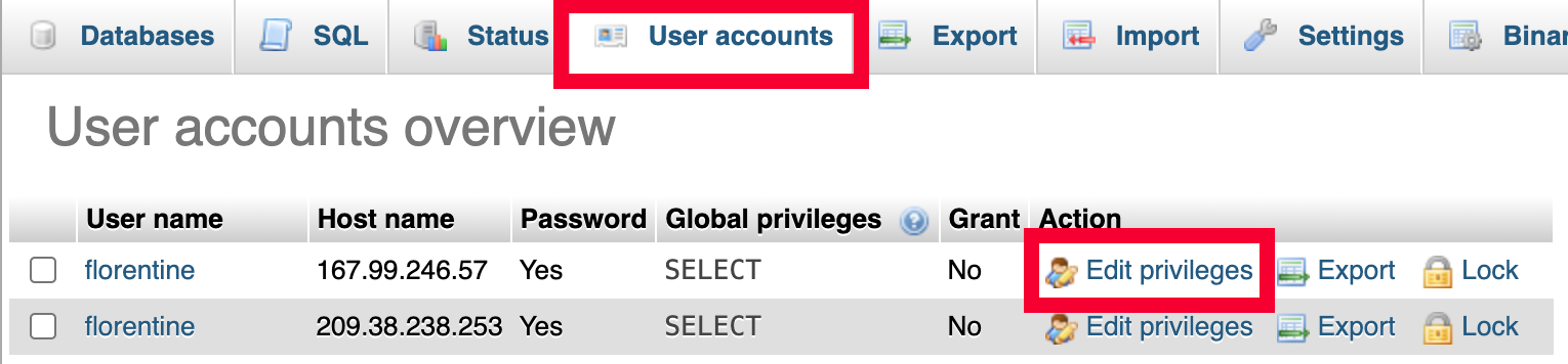 Navigate back to User accounts via the top navigation and click on Edit privileges next to the first user created in the previous step: