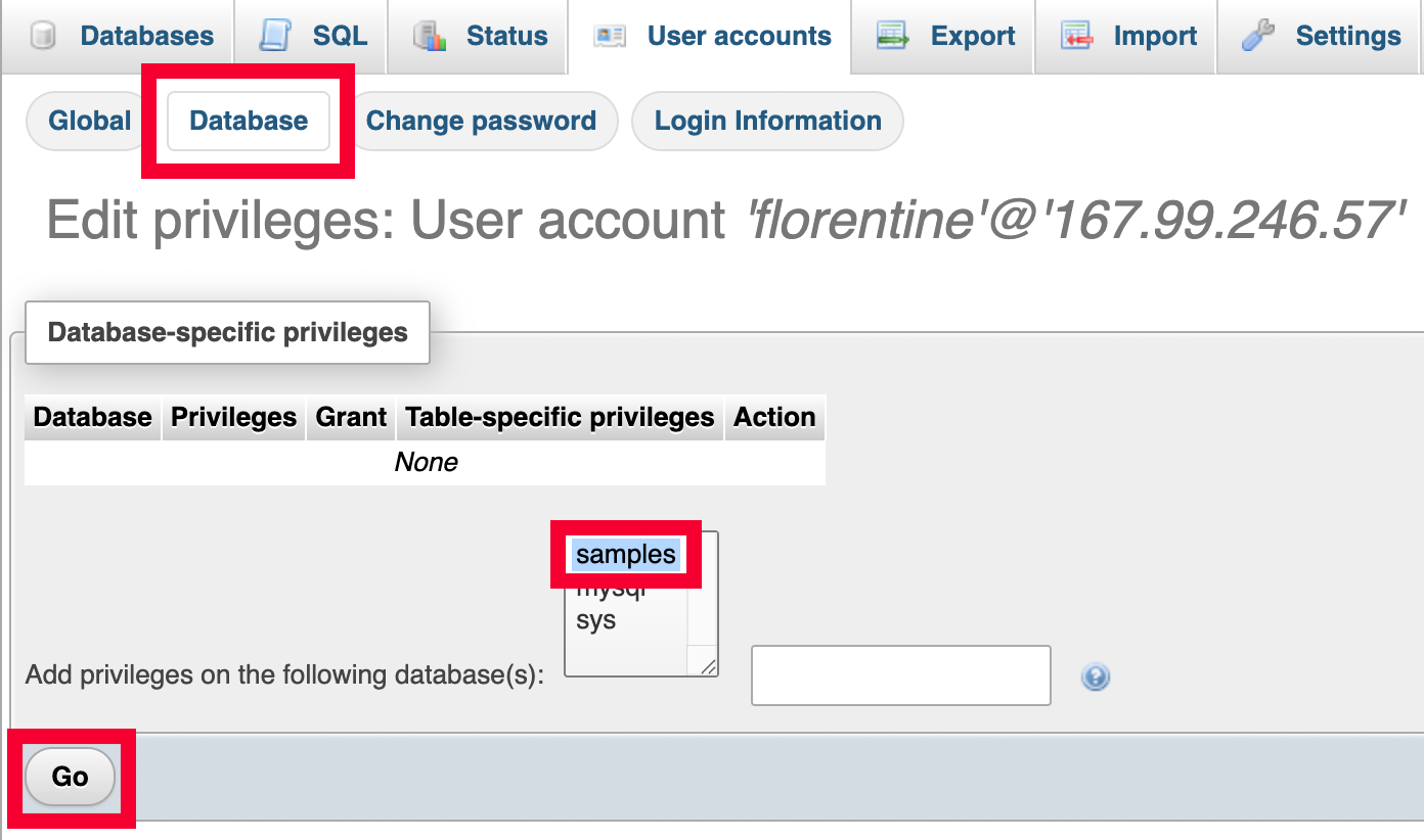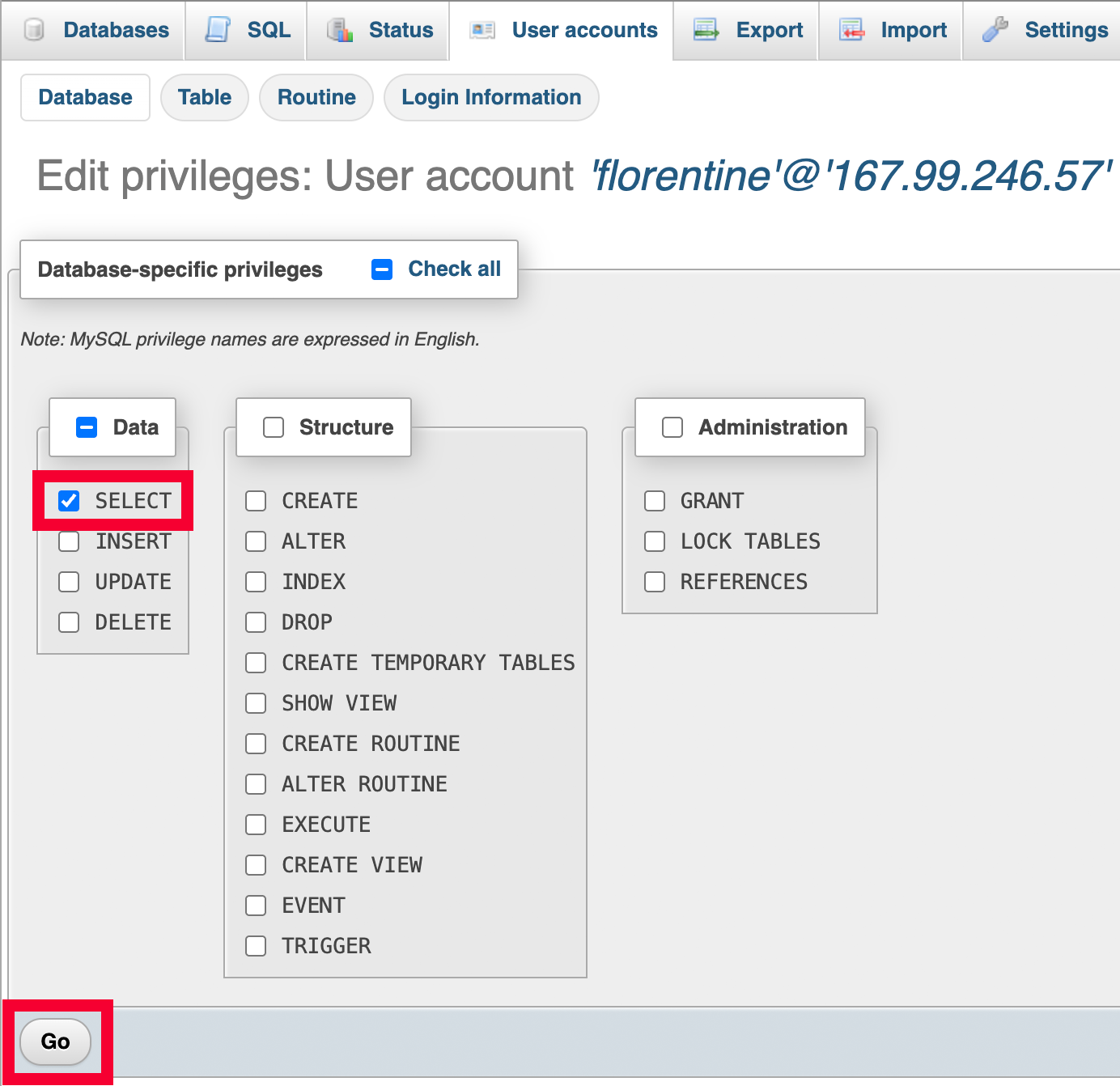 In the Data section inside the opening Database-specific privileges section, check SELECT and click on Go: