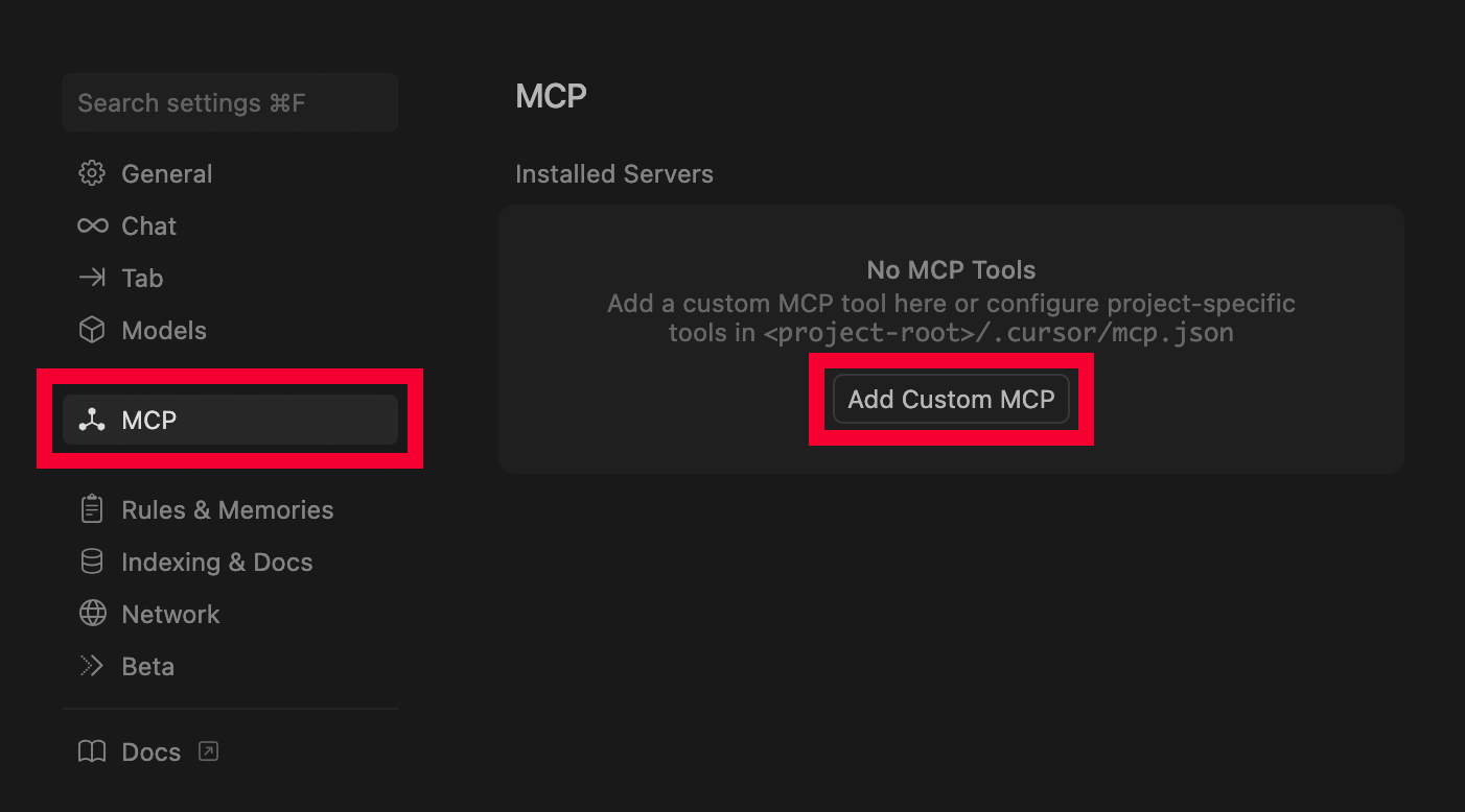 Then click on MCP in the settings side navigation and click on Add Custom MCP: