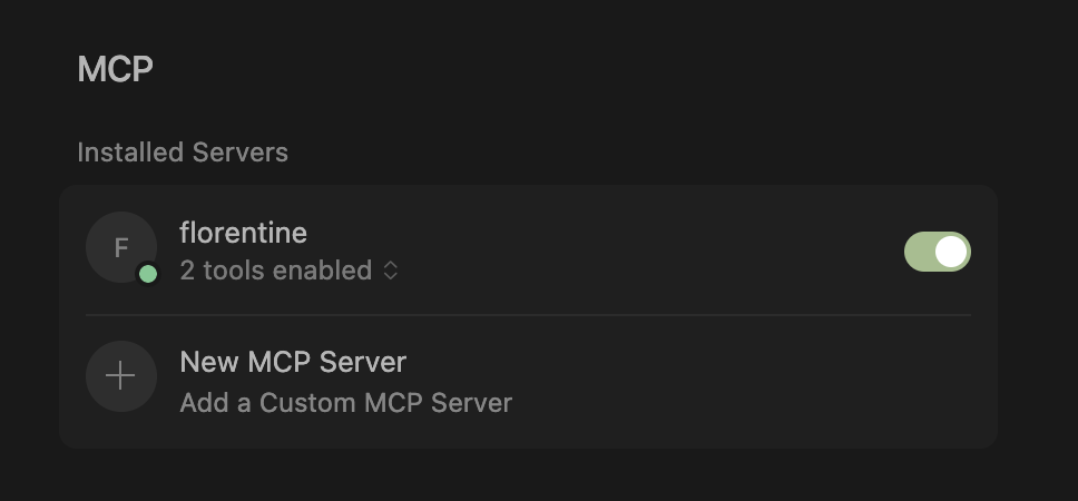 }Save and close the configuration file. You should now see the Florentine MCP being enabled and ready to use: